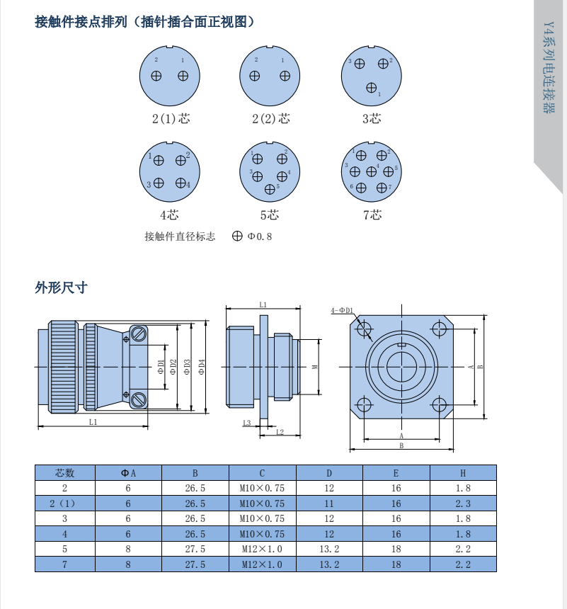 Y4小體積螺紋鎖緊連接器,體積小,質(zhì)量輕,螺紋連接,插拔靈活,插拔無需空間,對準(zhǔn)大徑后直接螺紋固定,一般鋁合金材料,化學(xué)鍍鎳表面處理。一般用于儀器儀表線路的連接。