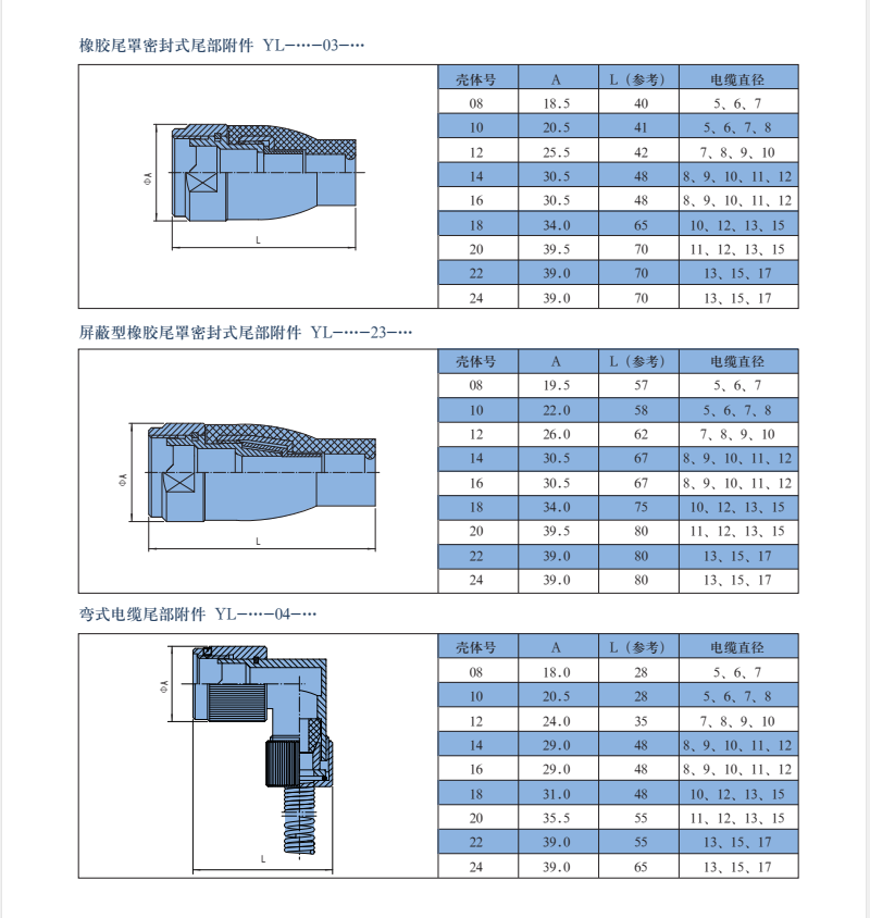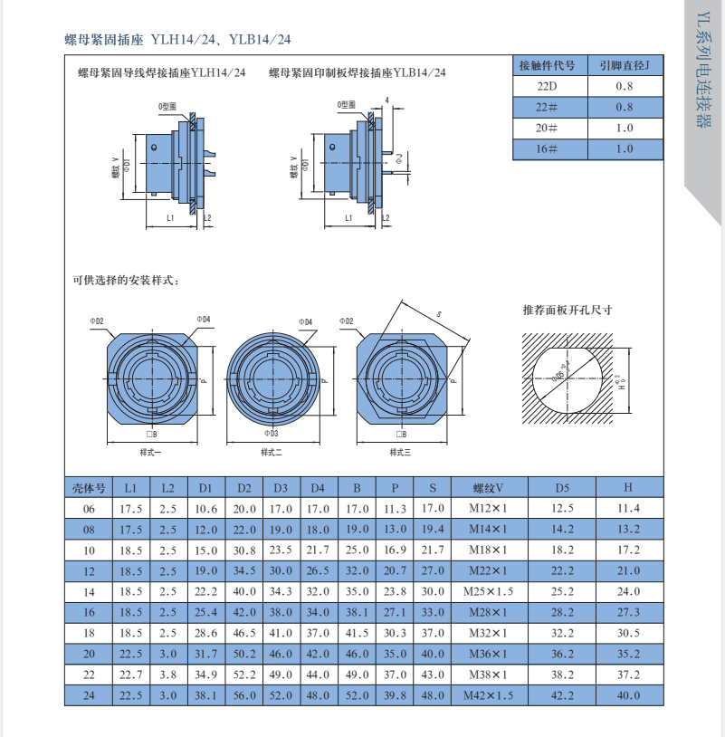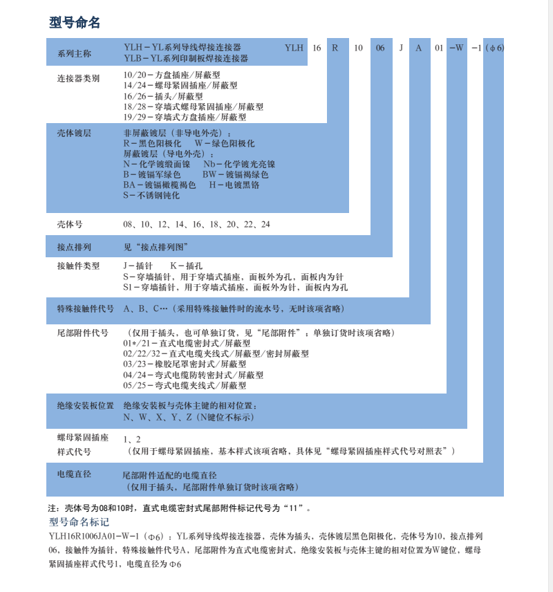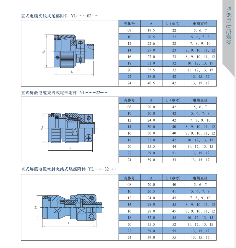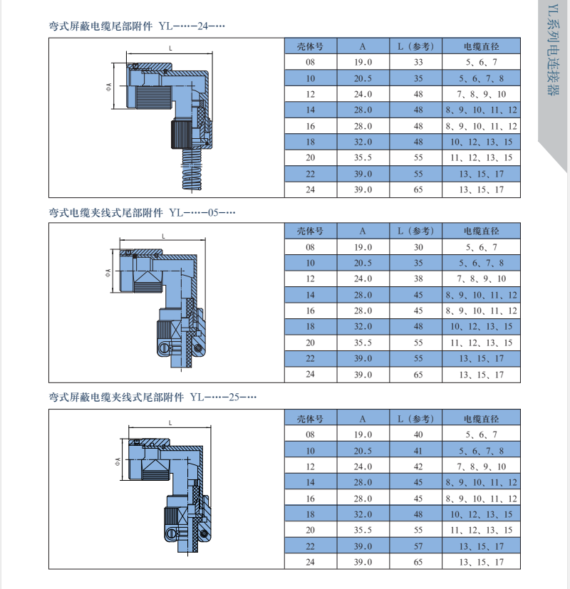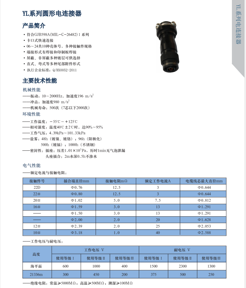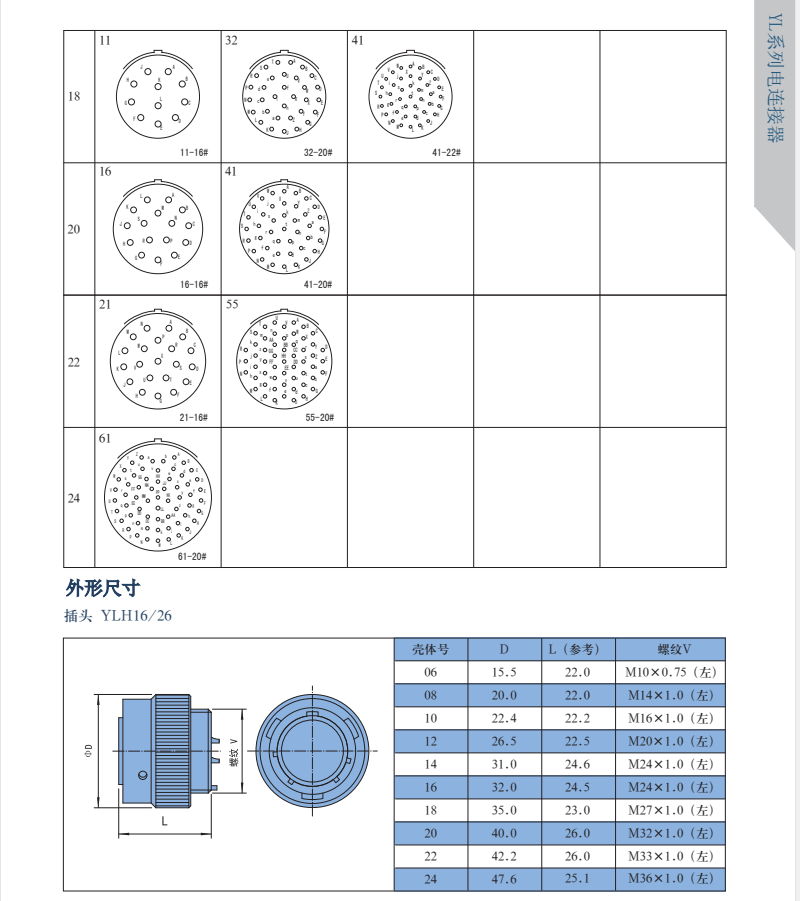YL系列圓形電連接器,有多種接觸件規(guī)格,插針有粗細(xì),電流有大小,端接形式有焊接和印制板焊接,尾部有直式和彎式,等同于Y50EX系列航空插頭。