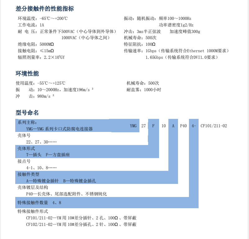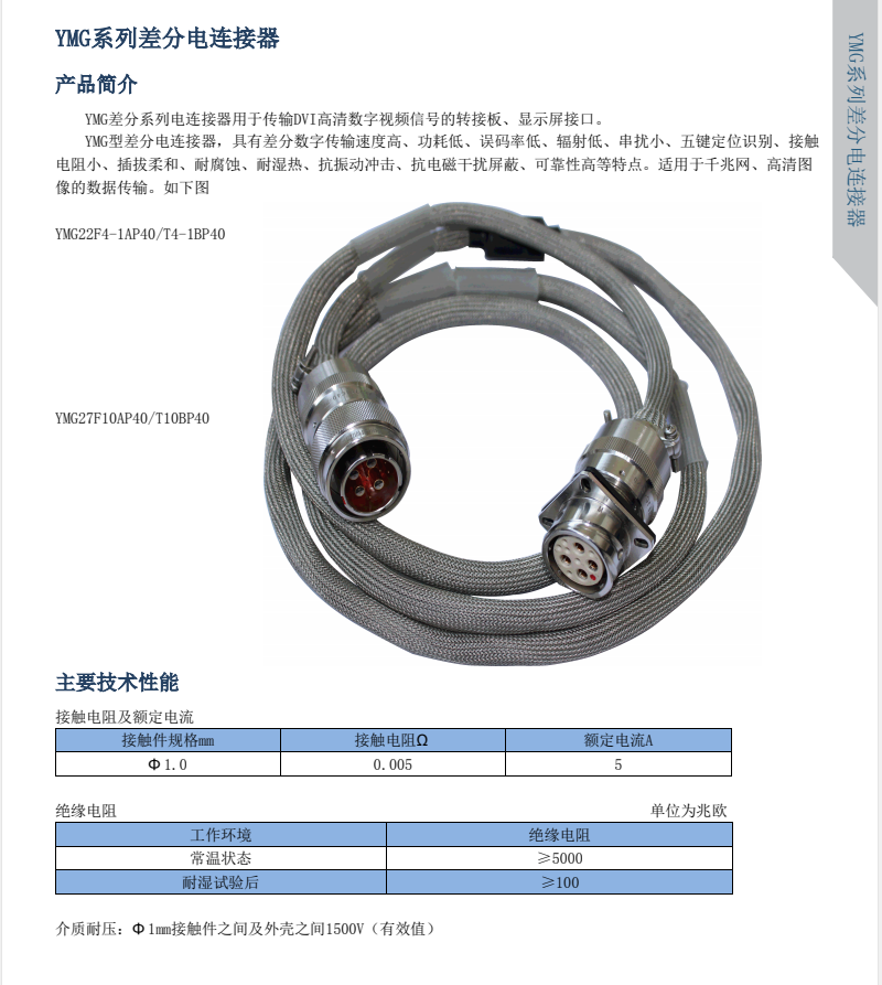 YMG系列差分電連接器,差分?jǐn)?shù)字傳輸速度高,誤碼率低,輻射低,串?dāng)_少,耐腐蝕,抗振動(dòng)沖擊,抗電磁干擾屏蔽,可靠性高特點(diǎn),適用于千兆網(wǎng),高清圖像的數(shù)據(jù)傳輸。