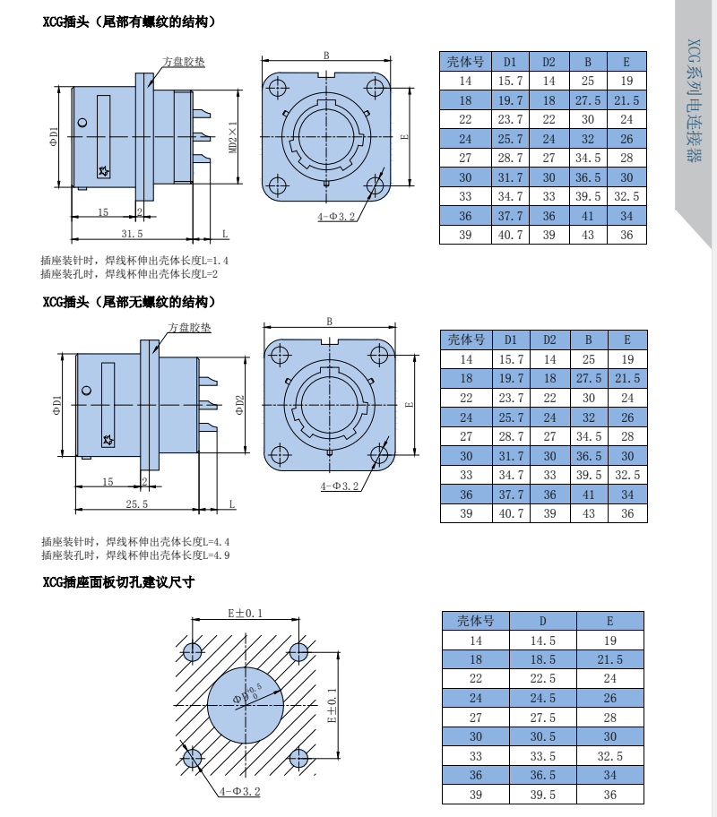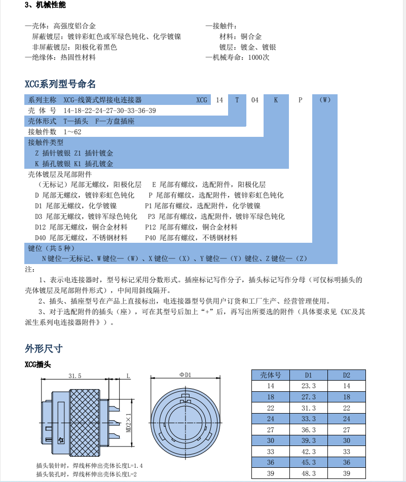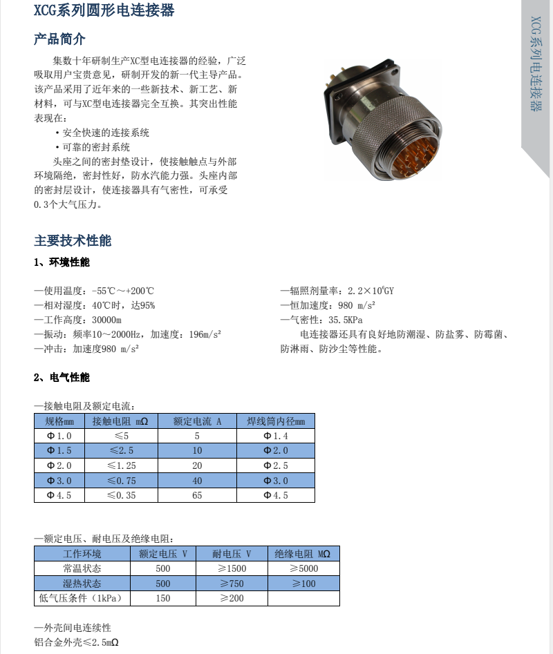 XCG系列圓形航空插頭,其尺寸大小與XC系列相同,同等芯數(shù),同等殼體可以互換,特點在于頭座之間有密封層設(shè)計,密封性能好,可以承受0.3個大氣壓,一般用于液體罐里外電流或信號的輸送。