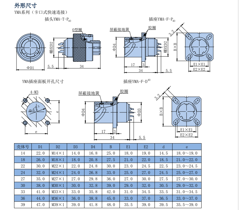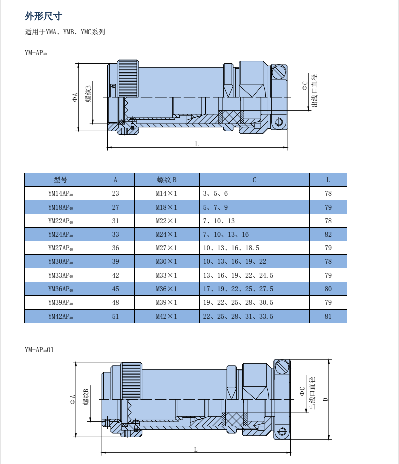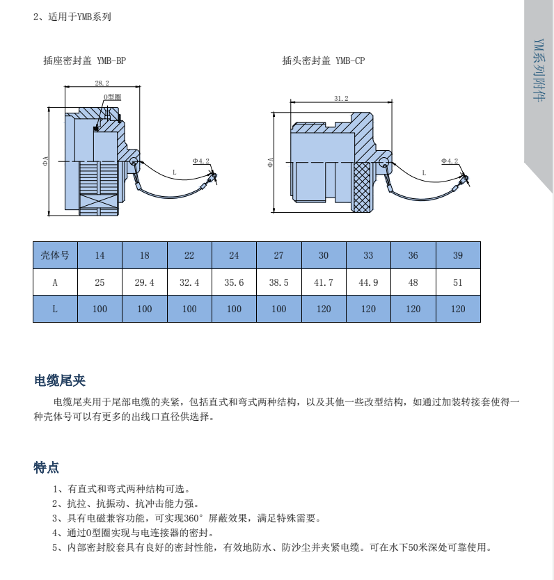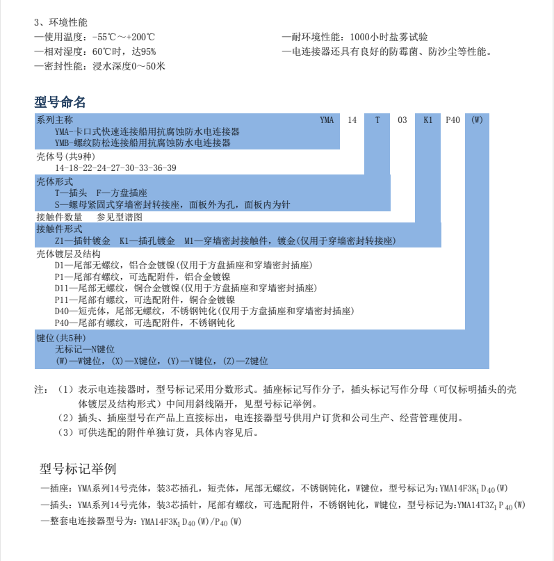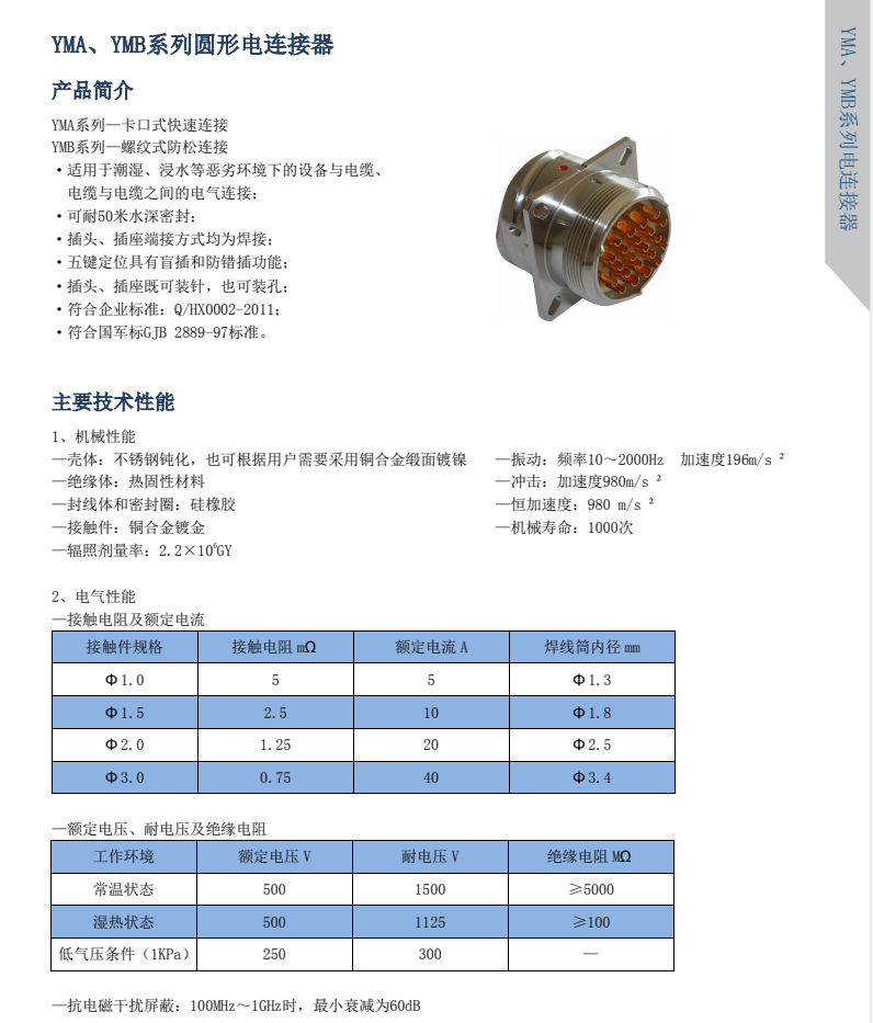 YMA、YMB系列船用圓形電連接器,YMA系列卡口式快速連接,YMB系列螺紋連接,適用于潮濕、浸水等惡劣環(huán)境下的設(shè)備與電纜之間的電氣連接。尾部有防松結(jié)構(gòu)并且防水密封。端接形式均為焊接式,方便快捷。
