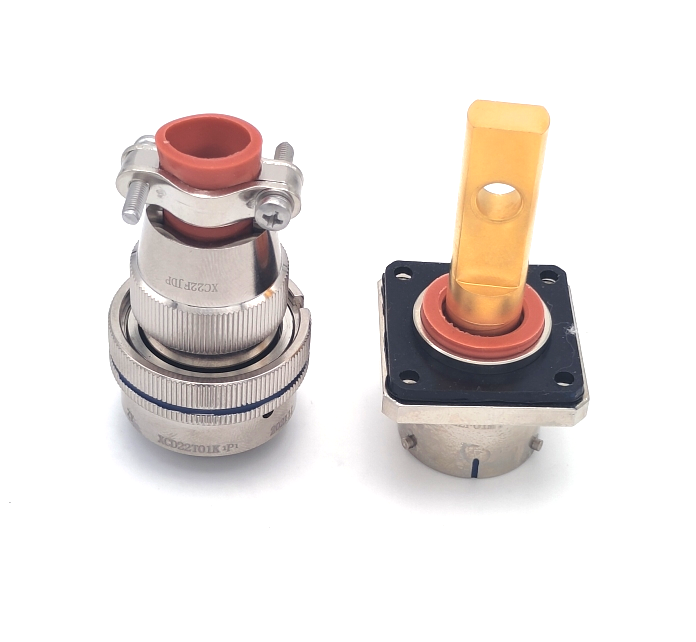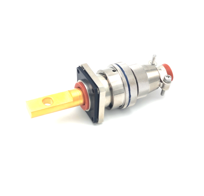 200A 單芯 真空氣密封連接器,電流大,額定電流200A,耐壓1500V,絕緣電阻5000歐姆,插座方法蘭,四只小螺絲固定,采用玻璃燒結(jié)工藝,密封性能好,端接形式線鼻子連接,線纜壓接好后,再用螺絲固定。