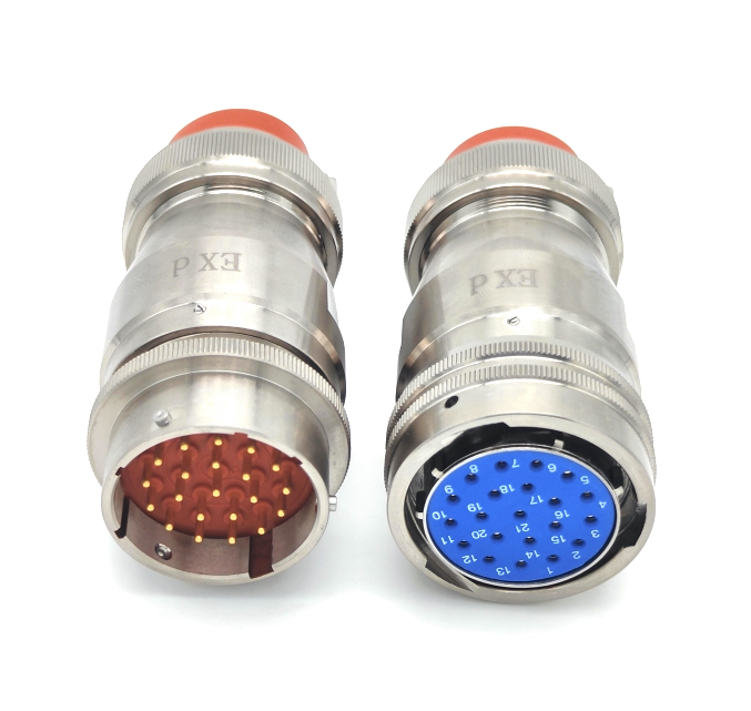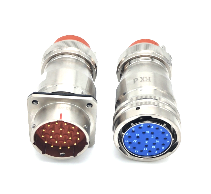 21芯10A圓形不銹鋼對(duì)接式隔爆連接器,多芯大電流防爆連接器,接觸件21芯,每芯達(dá)10安倍電流,端接形式焊接,接觸性能可靠?,F(xiàn)場(chǎng)操作無(wú)火源,可以采用壓接形式。插頭與插座卡扣連接,三只鉚釘雙重鎖緊,抗震防摔。不銹鋼材料,防鹽霧防腐蝕。壁體厚,耐高溫防爆,一般用于液化氣體泄漏,杜絕可能的爆炸。