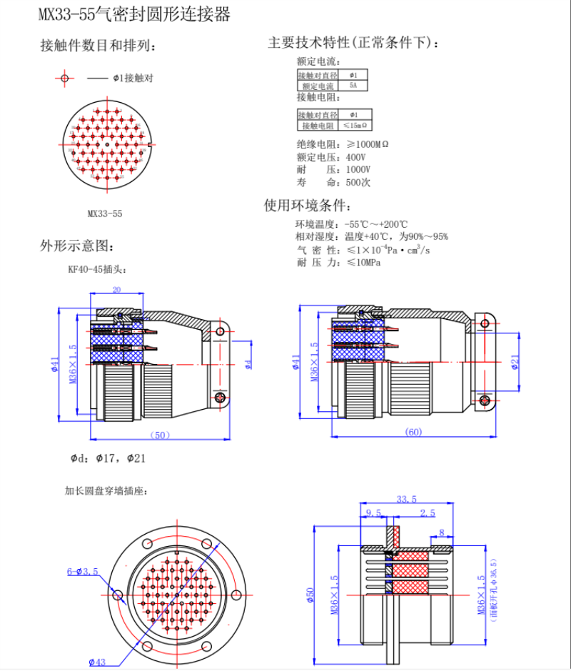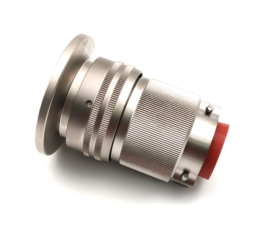 產(chǎn)品是借用KF40法蘭盤尺寸,中間設(shè)計(jì)55P可伐合金插針,經(jīng)過特殊加工工藝-玻璃燒結(jié),密封性能好。與插頭有兩種連接方式,螺紋連接和卡口連接。插頭材料根據(jù)使用環(huán)境選用,有鋁合金和不銹鋼, 應(yīng)用于真空設(shè)備與電纜之間的連接,數(shù)據(jù)的傳輸。
