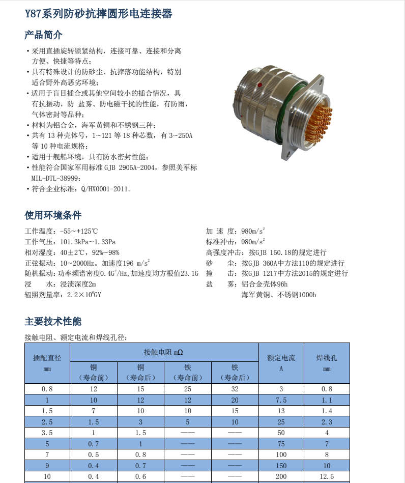 Y87防砂抗摔圓形電連接器,是Y27系列改進升級產品,具有特殊設計,插合面密封,防砂層,特別適合野外高惡劣環(huán)境,具有防水密封性能,產品有抗震,防鹽霧,防電磁干擾的性能,一般用于發(fā)射車,艦船線路的連接。